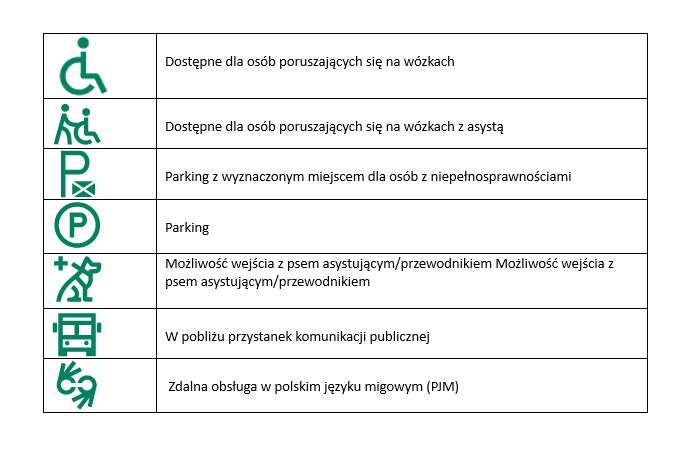 Symbole graficzne (znajdujące się na stronie internetowej) wraz z ich opisem, którymi posługujemy się dla opisu dostępności architektonicznej/udogodnień w naszych placówkach: